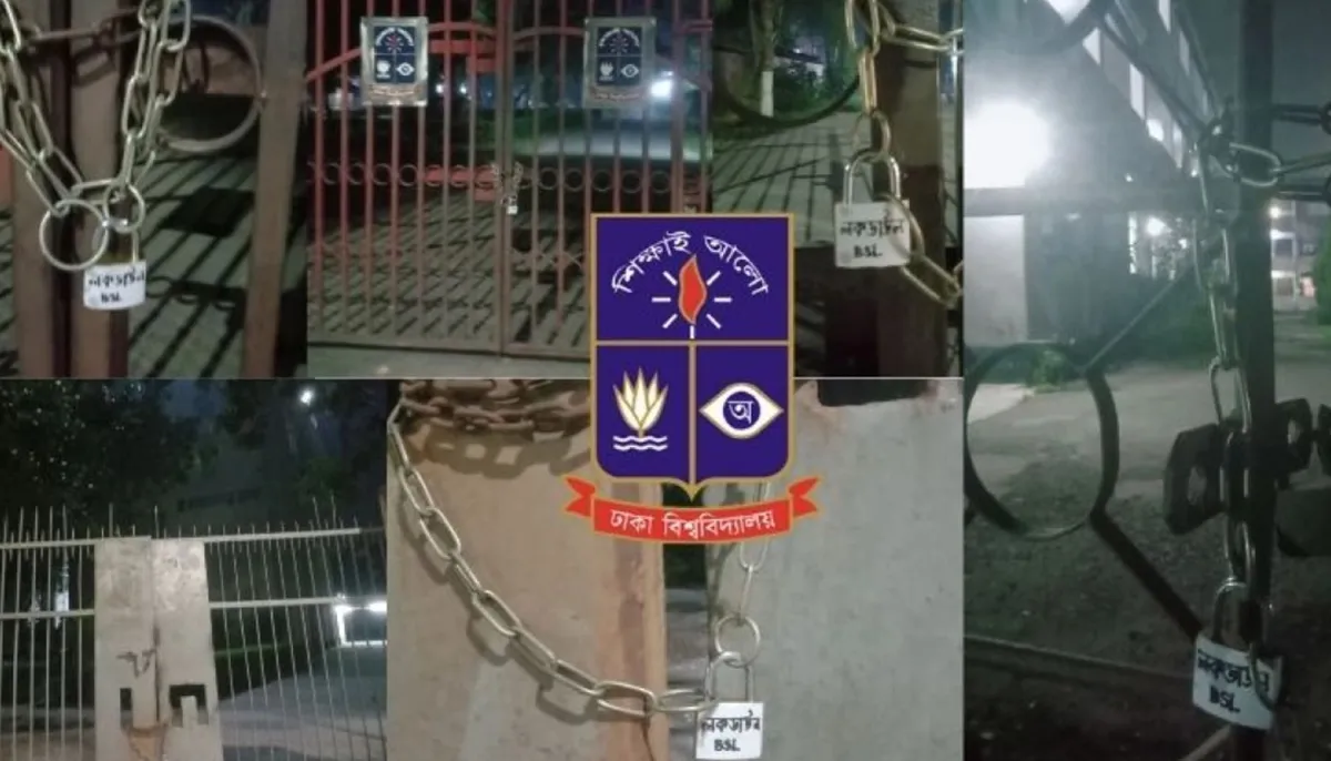 ঢাকা বিশ্ববিদ্যালয়ের (ঢাবি) চারুকলা অনুষদসহ মোট পাঁচটি স্থাপনার মূল ফটকে তালা ঝুলিয়েছে নিষিদ্ধ ঘোষিত সংগঠন বাংলাদেশ ছাত্রলীগের (বিএসএল) নেতাকর্মীরা। দলটির ঘোষিত ‘লকডাউন’ কর্মসূচির অংশ হিসেবে মঙ্গলবার (১১ নভেম্বর) দিবাগত রাতে এসব স্থাপনায় তালা লাগানো হয়।তালা দেওয়া স্থাপনাগুলোর মধ্যে রয়েছে—চারুকলা অনুষদ, শিক্ষা ও গবেষণা ইনস্টিটিউট (আইইআর), পুষ্টি ও খাদ্যবিজ্ঞান ইনস্টিটিউট, কার্জন হলের প্রধান ফটক এবং বিজ্ঞান ভবন।